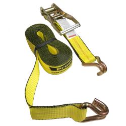 Manufactured from a 2 inch wide heavy duty polyester material with a minimum breaking strength of 10,000 pounds. Fitted with 1/2" wire hooks on ratchet end and tail end. The wire hooks (double j) offer a versatile hook while not compromising on strength. The ratchet is a long wide handle for ease and convenience. The webbing is marked with the working load limit, and each sewn end has a working load limit tag attached. All material, fittings and assembly complies with CVSA, DOT, CHP and WSTDA standards.